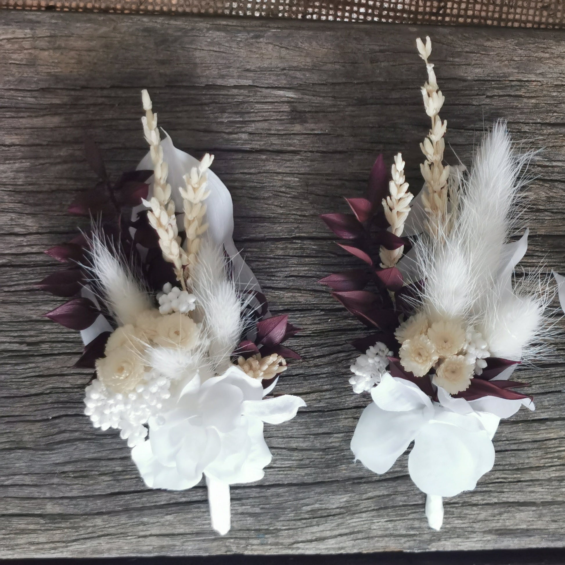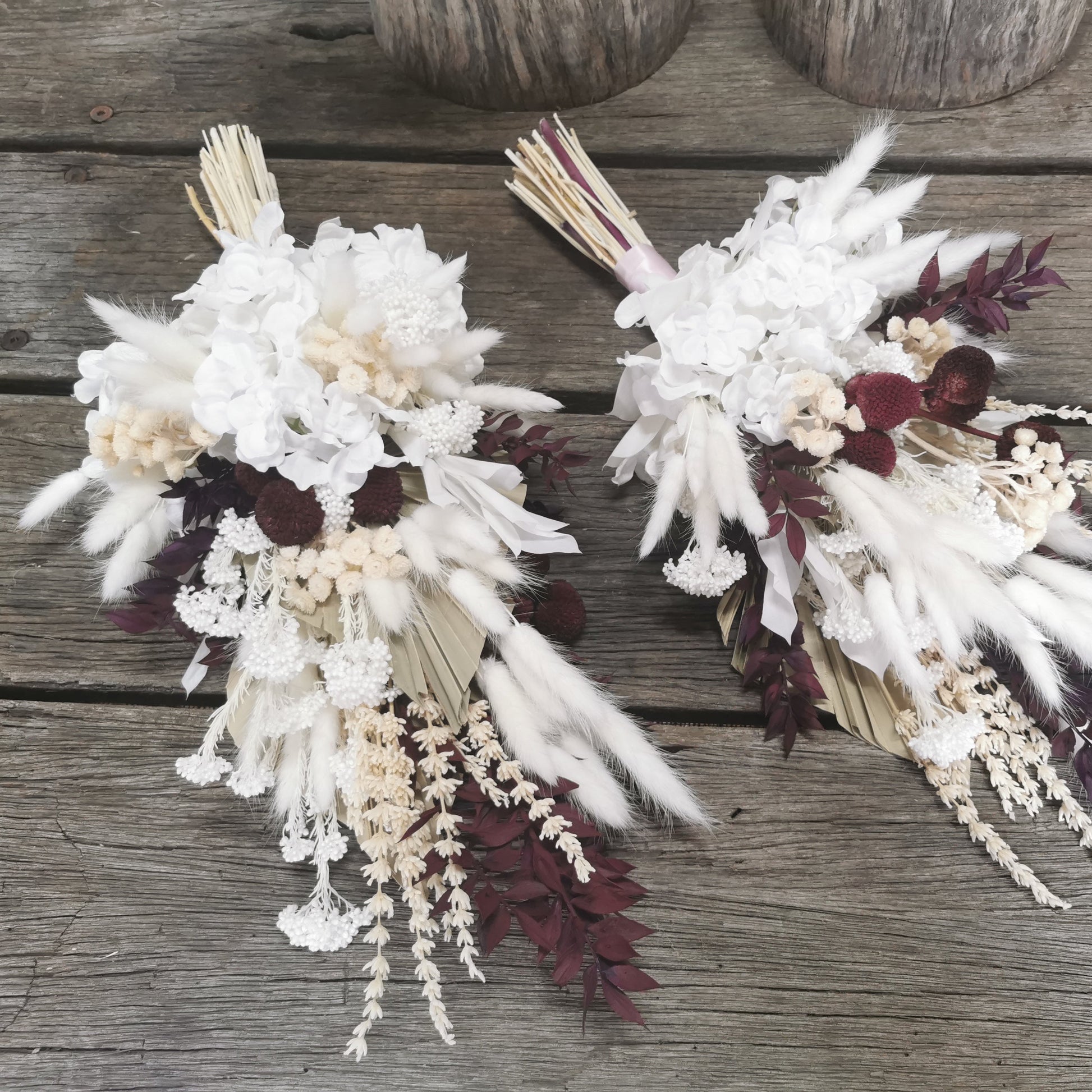 Elevate your wedding day with this sophisticated dried flower bridal bouquet, expertly crafted to combine timeless elegance with lasting beauty. The harmonious blend of pristine white and creamy tones creates a romantic foundation, while subtle burgundy accents add depth and visual interest. Dried flowers offer exceptional durability, making this bouquet perfect for extended celebrations, destination weddings, or cherished keepsakes. Each stem is carefully selected and arranged to ensure a full, luxurious appearance that photographs beautifully. This heirloom-quality piece requires no water or special care, allowing you to focus entirely on your special day.